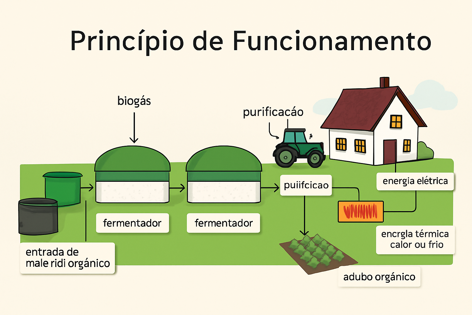 O biogás, uma mistura gasosa composta principalmente por metano (50-75%) e dióxido de carbono (25-40%), acumula-se na parte superior do digestor e pode ser coletado e utilizado como fonte de energia. Já o biofertilizante, uma biomassa líquida rica em húmus e nutrientes, é um excelente adubo natural que melhora a qualidade e a produtividade do solo.